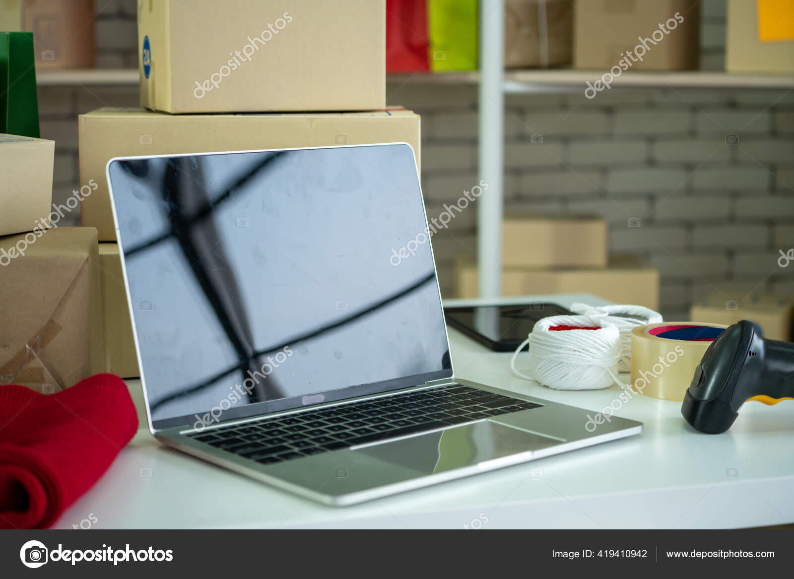 Ordenador Portatil Pantalla Vacia Con Caja De Envio En Segundo Plano Foto De Stock C Biancoblue 419410942